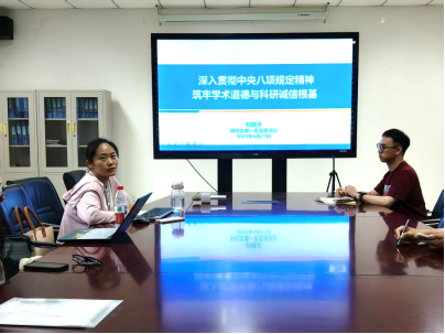 首先,刘翼天老师以《深入贯彻中央八项规定精神,筑牢学术道德与科研诚信根基》为主题为党员同志上了一堂党课。她着重强调了学习八项规定精神的重要性并逐一解读,并强调学术诚信,通过学术不端案例警示大家要恪守学术道德,严守纪律底线,自觉抵制各种不正之风,营造风清气正的学术环境,永葆清正廉洁的政治本色。