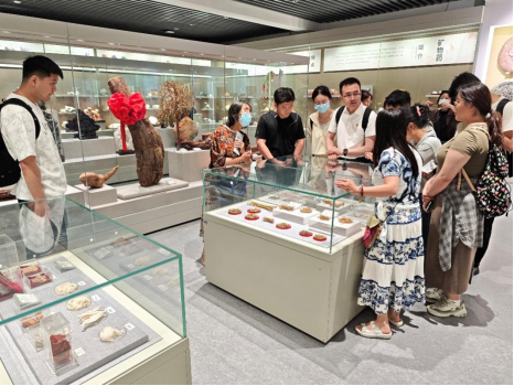 接着,参观了《中药综合展厅》。同学们观看了常见植物药、动物药的标本,熟悉了各种药材标本的制作方法以及常用功效,罕见的朱砂、炉甘石、雄黄等矿物药和巨型人参、百年陈皮、马宝等特殊药材标本给大家留下了深刻的印象。