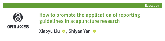 近日,针灸推拿学院闫世艳研究员以通讯作者在BMJ Evidence-Based Medicine期刊(影响因子:9.8,JCR分区:Q1)发表题为“How to promote the application of reporting guidelines in acupuncture research”的论文。该论文系统梳理了目前针刺研究领域已经发表以及正在制定的报告指南,从多个维度提出了促进针刺研究报告指南应用的建议与策略,为针刺研究报告指南的应用与发展提供了有力参考。